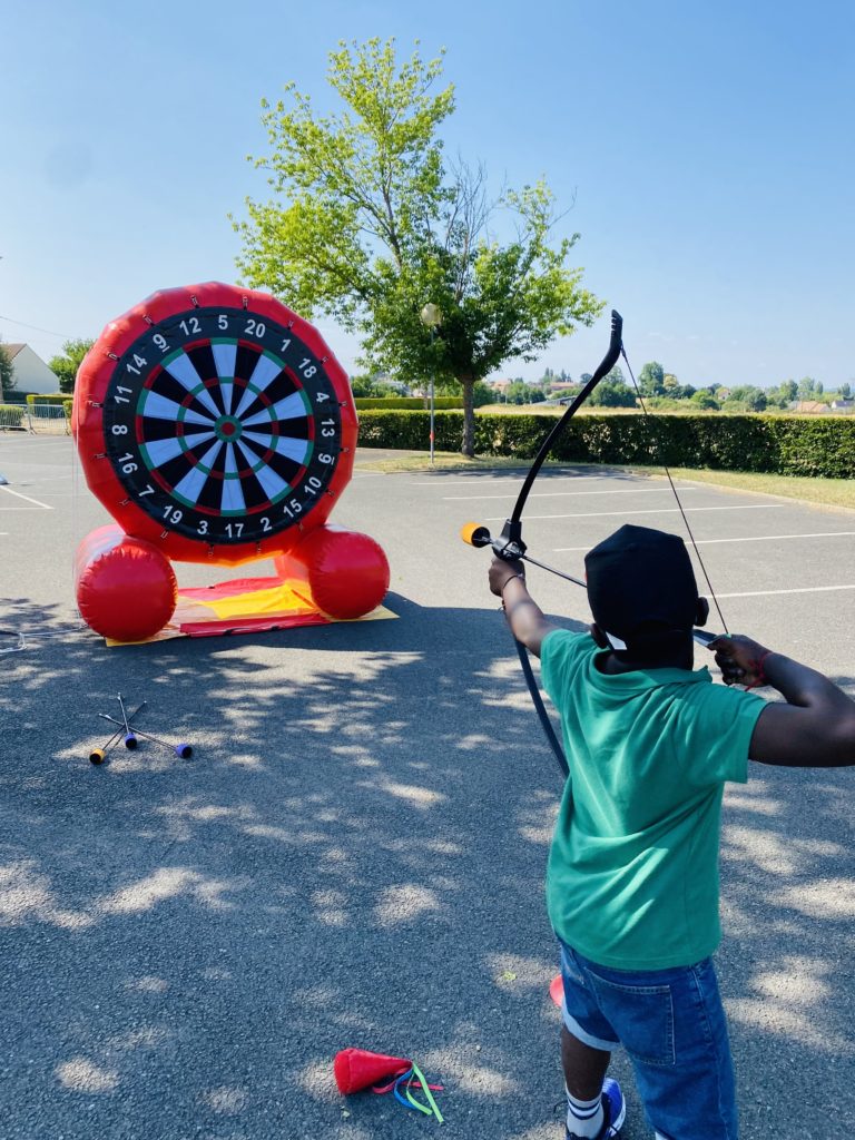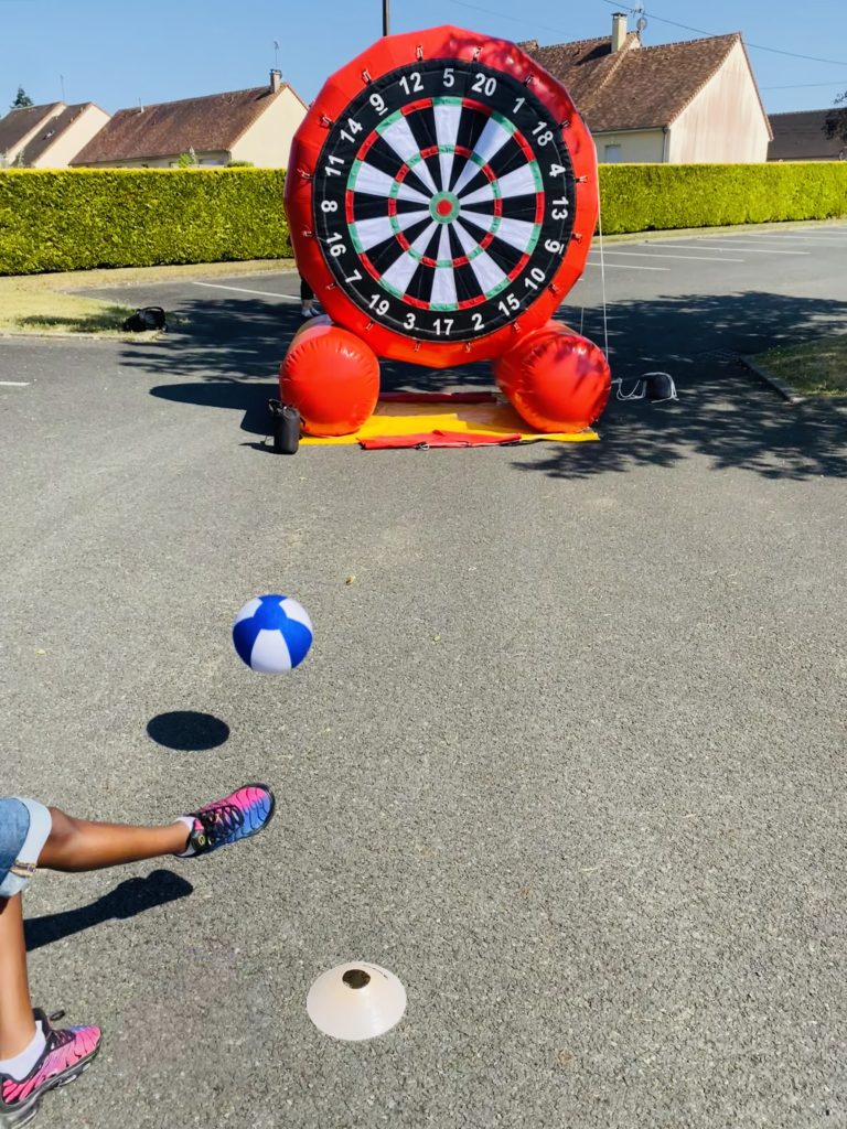 Une structure gonflable géante sert de cible et les fléchettes ont été remplacés par des ballons.